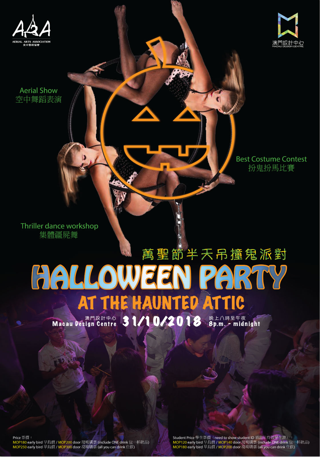 活動包括有驚悚舞蹈工作坊、空中表演、音樂和飲料、扮鬼扮馬比賽、美好時光。最佳扮鬼扮馬比賽的優勝者將獲得由空中藝術協會和澳門設計中心贊助的豐富獎品!